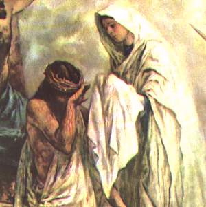 The Sixth Station: As God's chosen ones we are to show mercy and compassion in our dealings with others. It is our mission to comfort the sorrowing, to put new heart into the disheartened, and to raise the spirits of those we meet. A woman of courage steps forward to do what no one else dared to do. She wipes away the blood and spittle from his face, and receives in return a precious representation of his features. Veronica teaches us a priceless lesson: Like her, we must have the fortitude to stand with those who are friendless even though others lack the courage to draw near. At times we must even take a controversial stand which makes us look ridiculous to some. Prayer |